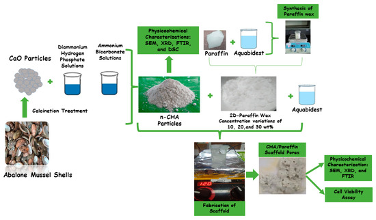 The fabrication process is divided into two steps: synthesis and characterization of nano-CHA and CHA/Paraffin wax nanocomposite scaffolds by varying paraffin wax concentration at 10, 20, and 30 .%. The schematic procedures for this work can be seen in Figure 1.