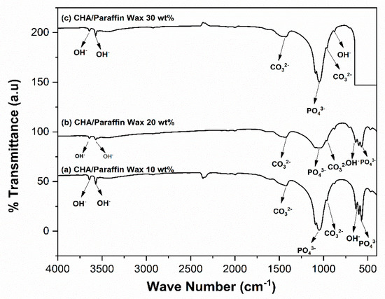 FTIR spectra of: (a) CHA/paraffin wax 10 %; (b) CHA/paraffin wax 20 %; (c) CHA/paraffin wax 30 %.