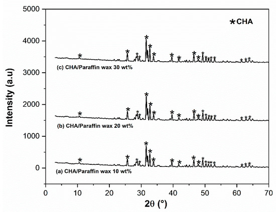 Interactions between the CHA particles and the paraffin wax at their interfaces can also cause the formation of an amorphous layer of paraffin wax. These interactions are affected by hydrogen bonding between the exposed OH− groups on the CHA particle surfaces and the polymers. This could reduce the crystallinity of the CHA/paraffin wax composite, as shown in Table 2 [20,35]. As shown in Figure 4, the paraffin wax was absolutely degraded from the scaffold [4,17]. The crystallite size was also reduced. These observations were due to because of the use of a suspension of a dry scaffold in the calcination treatment. The fluid in the compound affected the forming of dihedral angles between the particles and produced repulsive forces between the particles that prevented the CHA particle accretion [4,17].