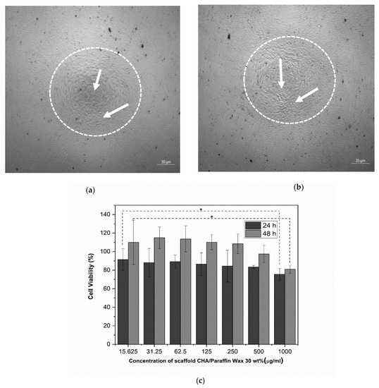 Morphology on CHA/paraffin wax 30 .% nanocomposite scaffold after being incubated for: (a) 24 h; (b) 48 h (The white arrows indicated that the MC3T3E1 cells grows in scaffold); (c) cell viability assay of the CHA/paraffin wax 30 % nanocomposite scaffold after being incubated for 24 h and 48 h (*: p 0.05).