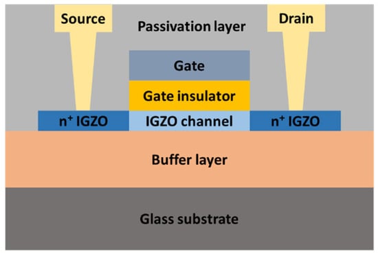 Structure of the fabricated SA-TG coplanar IGZO TFT.