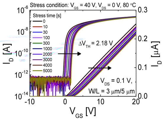 Figure 5a shows the time evolution of ΔVTH at different stress/recovery time pairs, and Figure 5b shows the time evolution of the PBTS-induced ΔVTH by both the recoverable and non-recoverable trapped electrons, obtained by applying the stress-time-divided measurement technique to Figure 5a. Figure 5b shows that the time evolution of both ΔVTH for the recoverable and non-recoverable trapped electrons were well-fitted by the stretched-exponential function. Generally, the stretched-exponential time dependence of ΔVTH is observed when electrons are trapped in the trap states at a single energy level [22,23]. The stretched-exponential equation for the ΔVTH(t) is defined as: