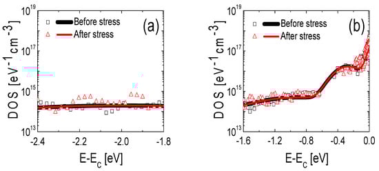 Therefore, the effects of PBTS on the subgap DOS in the channel layer must be examined before quantitatively analyzing the PBTS-induced trapped electron distribution within the gate dielectric in IGZO TFTs. Figure 3a,b demonstrate the energy distribution of the subgap DOS extracted using the MPCV technique before and after the application of the PBTS (VGS = 40 V, VDS = 0 V, 80 °C) for a stress time (tst) of 5000 s. The results presented in Figure 3 show that the difference between the energy distribution of the subgap DOS extracted from the TFT before and after PBTS was minimal, indicating that the electron injection from the channel (IGZO) to the gate dielectric (SiO2) in the fabricated SA-TG IGZO TFTs caused the PBTS-induced transfer curve shift observed in Figure 2.