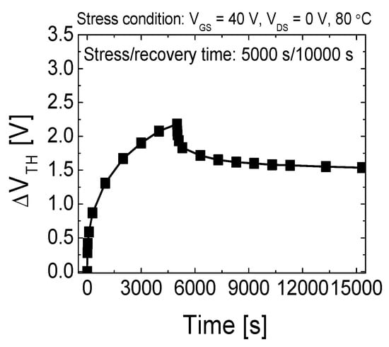 Time evolution of ΔVTH during the stress (VGS = 40 V, VDS = 0 V, 80 °C, tst = 5000 s) and subsequent recovery (VGS = 0 V, VDS = 0 V, 80 °C, tst = 10,000 s) phases.
