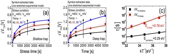 (a) Dependence of ΔVTH (t) on stress temperature for the electrons trapped in the shallow trap under PBTS (VGS = 40 V, VDS = 0 V, tst = 5000 s). (b) Dependence of ΔVTH (t) on stress temperature for the electrons trapped in the deep trap under PBTS. (c) Characteristic time constant as a function of the PBTS temperature to extract the effective energy barrier (activation energy), for each trap.