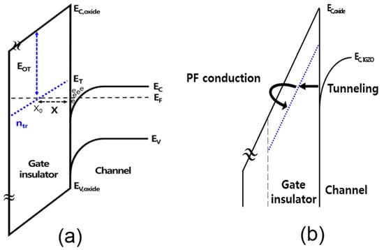 Finally, we extracted the PBTS-induced trapped electron distribution in the shallow and deep SiO2 gate dielectric traps in the fabricated SA-TG coplanar IGZO TFTs. Figure 7a presents the energy band diagram of the IGZO TFT under PBTS, where x represents the direction from the IGZO/SiO2 interface to SiO2. The energy level ET of the electron trap is defined by ΔEOT [eV], which indicates the energy difference between ET and the SiO2 conduction band minimum (EC, oxide). The Fermi energy level (EF) and ET cross at x0, which is extracted using the response time of the traps at the interface; the detailed methodology is provided in [24]. There were three different cases of trapped electrons in gate dielectrics under PBTS in IGZO TFTs. As depicted in Figure 7a, under a small VGS for a short tst, the electrons could not transfer to the position x0 and tunnel back easily to IGZO; as VGS and tst increased, the electrons tunneled deeper into the gate dielectric, and could not tunnel back easily to IGZO until they were trapped in ET below EF [10]. Further, as VGS and tst continued to increase, the trap states located near x0 were filled with electrons and thus could no longer capture them. The trapped electrons located below EF transferred to deeper positions by P–F conduction within the gate dielectric, as shown in Figure 7b [14,25].
