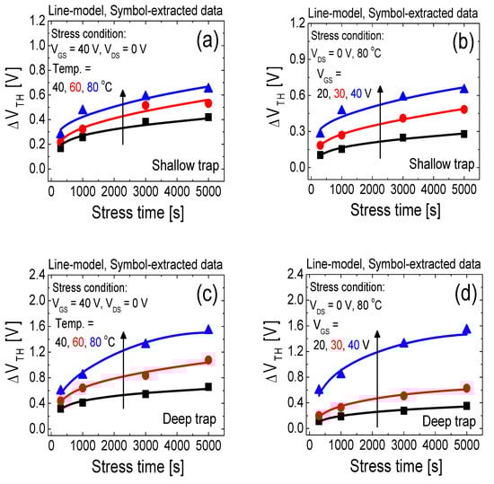 Dependencies of ΔVTH (t) on (a) T and (b) VGS for the electrons trapped in the shallow trap under PBTS (VGS = 40 V, VDS = 0 V, 80 °C). Dependencies of ΔVTH (t) on (c) T and (d) VGS for the electrons trapped in the deep trap under PBTS (VGS = 40 V, VDS = 0 V, 80 °C).