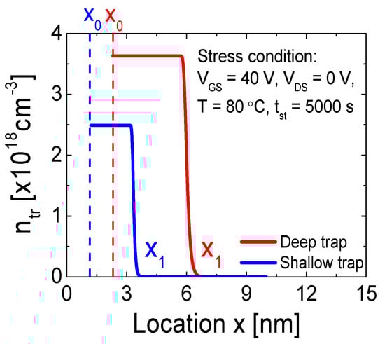 Figure 8a–d demonstrate the dependence of ΔVTH (t) on T and VGS for the electrons trapped in the shallow and deep traps under PBTS. By substituting the results in Figure 5b and Figure 8a–d into Equations (5)–(9), we could extract the ntr, x0, x1, and EOT parameters for each trap under specific PBTS conditions (in this study, VGS = 40 V, VDS = 0 V, 80 °C, tst = 5000 s). Figure 8 illustrates the extracted trapped electron distribution in the shallow and deep gate dielectric traps after the application of the PBTS (VGS = 40 V, VDS = 0 V, 80 °C) for 5000 s. Table 1 summarizes the ntr, x0, x1, and EOT values for the electrons in each type of trap. Although further study is necessary, the extracted EOT values for each gate dielectric trap suggest that the shallow and deep traps (Figure 9) possibly originated from the oxygen vacancy defect and E’ center defect in SiO2, respectively [29,30,31,32].