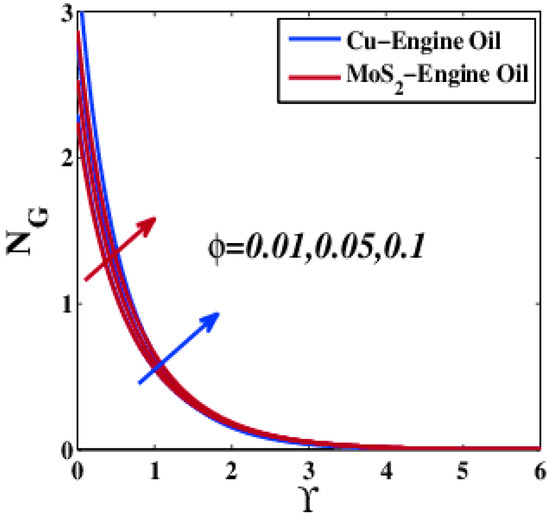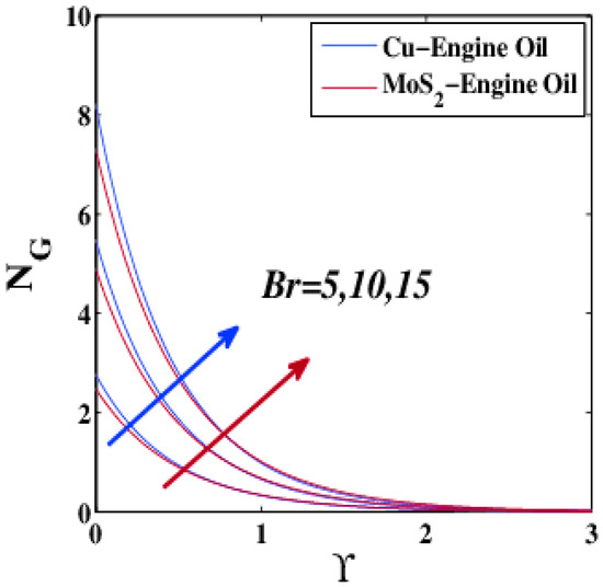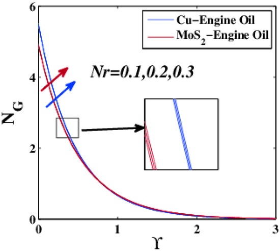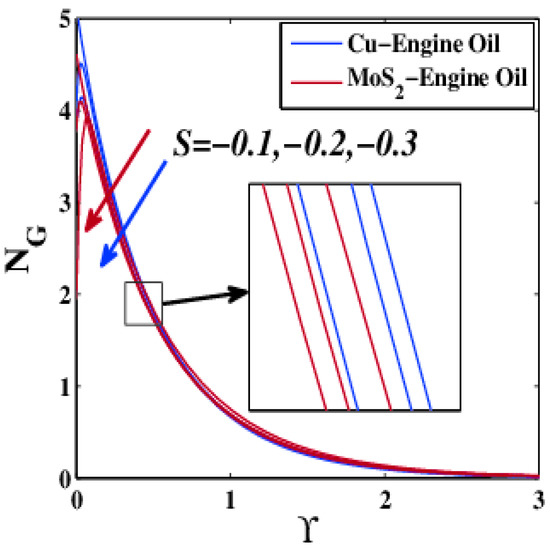 - At the small thickness boundary layer, the entropy generation of MoS2–EO was higher than that of Cu–EO when this profile was affected by Deborah number. Moreover, Cu–EO entropy generation was greatest for increasing series of porous media parameter, nanoparticle volume fraction parameter, velocity slip parameter, Biot number, radiation parameter, suction, injection, Reynolds number, and Brinkman number.