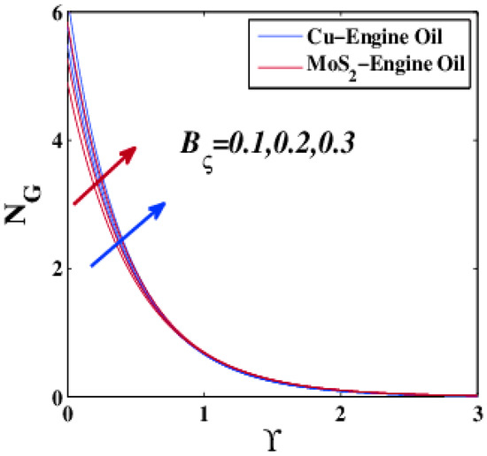 - The local Nusselt number was an ascending function of , and . Moreover, the local Nusselt number was a decreasing function of . The effects of and are valid for both Cu–EO and MoS2–EO. However, the effect of on the local Nusselt number was described as follows: (i) decrease for Cu–EO; (ii) increase for MoS2–EO.
