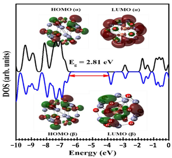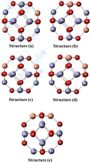 Five isomeric structures of the Cu2Zn10O12 cluster, labelled as a, b, c, d, and e (see Figure 1) that represent all potential locations for the copper atoms were studied in order to find the global minima structure of the investigated Cu2Zn10O12 cluster. Interestingly, it was observed that structure (a) is the most energetically stable structure. Figure 2a shows the fully optimized structures at the optimum spin and represents the energy variations of the structures relative to the most stable structure. Therefore, structure (a) was considered for further calculations. Figure 2b illustrates the energy variations of structure (a) versus the spin of the cluster. Figure 3 demonstrates the density of states as well as the HOMO and LUMO orbital for the most energetically stable structure of the Cu2Zn10O12 cluster. It is clear that the HOMO (α) orbital was localized on the O atoms whereas the LUMO (α) was localized on the Zn atoms of the cluster. This elucidated that the O atoms are electron-rich centers and the Zn atoms are electron-deficient centers.