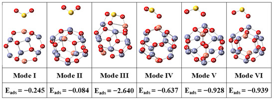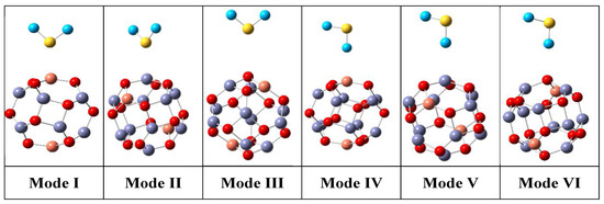 To understand the effect of the Cu2Zn10O12 cluster sensing features on H2S and SO2 gases, the characteristics of adsorbate-substrate interaction were scrutinized. For that, the adsorbates (H2S and SO2), substrate (Cu2Zn10O12), and the adsorbate-substrate complexes (H2S/Cu2Zn10O12 and SO2/Cu2Zn10O12) were fully optimized without any constraints. Since the adsorbed H2S (or SO2) molecule can interact via its S atom and H (or O) atom with the Cu, Zn, and O sites, six adsorption modes representing the previous possibilities were investigated (Figure 4). The adsorption energies for the investigated complexes were calculated by Equation (1).
