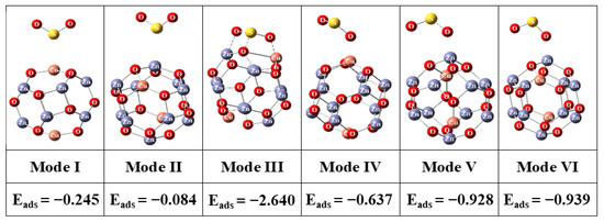 Figure 5 and Figure 6 show the optimized H2S/Cu2Zn10O12 and SO2/Cu2Zn10O12 complexes, respectively, with adsorption energies. It is worth mentioning that the adsorption heat that is more negative than −0.2 eV specifies the chemisorptions [67,68].