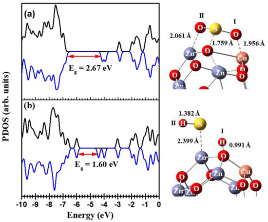 The DOS and the optimized structures for (a) SO2/Cu2Zn10O12(mode III) and (b) H2S/Cu2Zn10O12(mode V).
