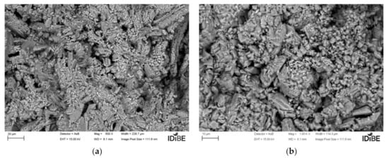 Figure 15, Figure 16 and Figure 17 show the micrographs of the mixtures of gypsum with citric acid at dosages of 0.02%, 0.06%, and 0.12% of additive, respectively. For citric acid, we can see a structure full of internal voids, which explains the lower mechanical resistance. The size of the crystals increases with the setting time, as can be observed in the micrographs.