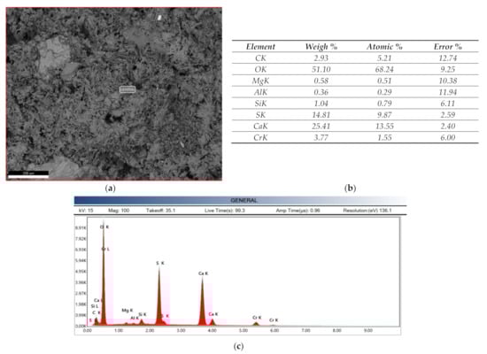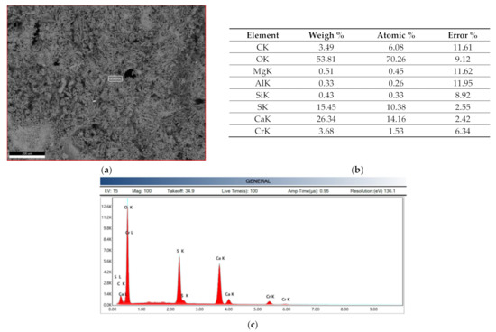 In Figure 22a–c, the micrograph of the mixture of gypsum with polycarboxylate and the percentages of the chemical elements as assessed using X-ray spectrography are shown.