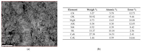 Analysis area and composition results (source: the author): (a) micrograph of calcium sulfate without additive; (b) chemical composition of the reference gypsum.