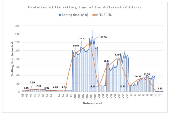 Regarding the setting times, the orange line shown in Scheme 1 represents the average values of the different batches containing different additives, while the blue bars indicate their individual setting times.