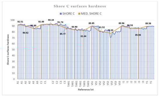 Regarding the Shore C hardness values (Scheme 3), the results were related to the percentages of additive used, decreasing slightly as additive % increased, with the highest Shore C hardness index value being achieved with C1 melamines, with a value of 93.19.