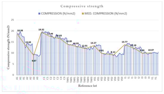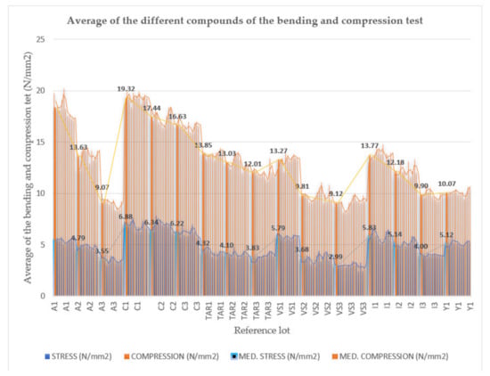 Making a comparison between the test groups, in Scheme 6 one can observe the mean mechanical resistance values (flexion and compression, N/mm2) shown for the different compounds and the proportionality between both. Also in Scheme 6, an overlay of Schemes can be seen that shows the average values obtained in the compressive strength tests (orange line) for the different batches containing different additives, along with the flexural strength values (blue line). As can be seen, the flexural strength are lower than the compressive strength values for all batches analyzed in the tests, although they are always greater than the minimum value established by the regulations.