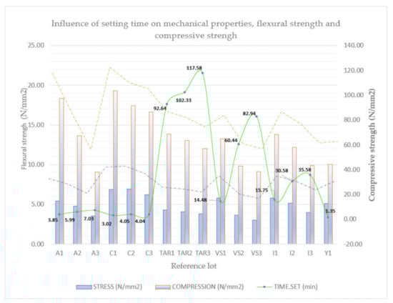 Influence of setting time on the mechanical properties, flexural strength, and compressive strength.