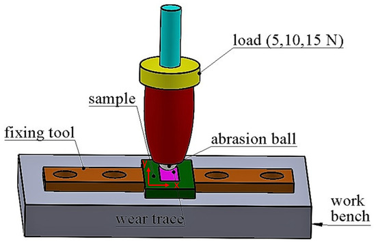 The dry sliding wear test was studied on a rectilinear reciprocating wear tester (Turkyus POD&HT&WT). Wear tests were carried out to use 6 mm diameter WC (1917 HV hardness) counter material on a rectilinear reciprocating wear tester due to its high hardness. Figure 1 shows the schematic diagram of tribotest. The x axis indicates the wear track width, and the y axis defines the wear ball movement direction during the tribotest.