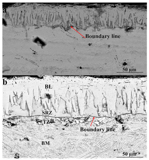 Several studies have found that the three regions are boride layer (BL), transition zone (TZ), and BM matrix in borided steel [17,29,39]. BM matrix was zone unaffected by heat or boron. TZ formed below the boundary line and was distinguished by the hardness different from that of the BM. Figure 3 also shows that there is a silicon-rich zone (SRZ) in the boride layer. Therefore, SRZ can be accepted as the fourth region of boride layer.