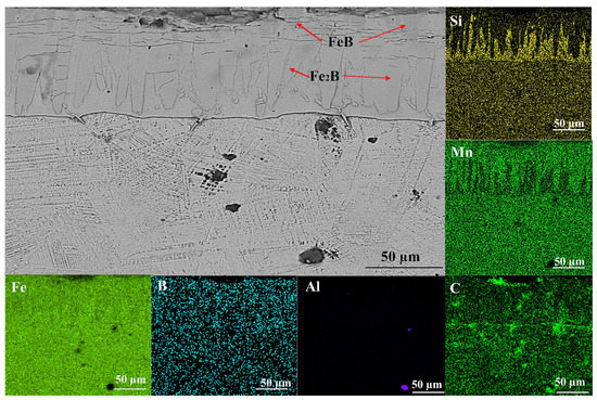 An evident boundary line that was not seen in many studies—particularly in studies exhibiting the saw-tooth morphology [16,31,38]—was also observed in Figure 2a,b and Figure 3. The boundary line separated the borided layer and transition zone. During boriding C and Si atoms diffuse away from the boride layer to the matrix and form boro-cementite (Fe3(B, C)) and iron-silico-borides as a separate layer under the Fe2B layer [32].