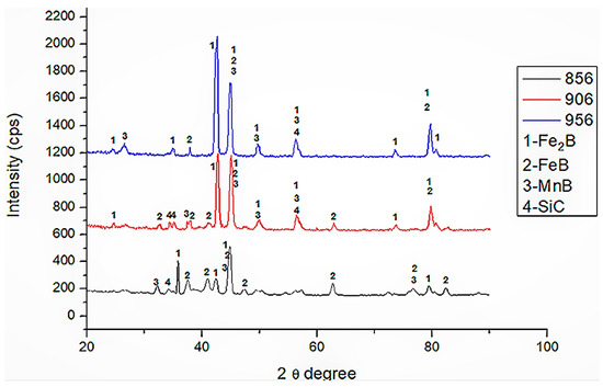 Figure 5 shows that the presence of Fe2B (JCPDS 00-003-1053), FeB (JCPDS 00-002-0869), SiC (JCPDS 00-002-1042), and MnB (JCPDS 03-065-5149) phases are detected in XRD analysis. Although FeB was not seen in SEM micrographs (Figure 2a,b), XRD results revealed its presence. XRD analysis revealed that the predominant phases were FeB and Fe2B. The aforementioned MnB adopted an isotropic orthorhombic Pnma structure with FeB [37]. This situation was discovered in Figure 3. Since Mn formed borides with a lattice constant similar to that of iron borides, it tended to dissolve in Fe2B and FeB phases. SiC can be formed during boriding due to the high level of Si in HMS.