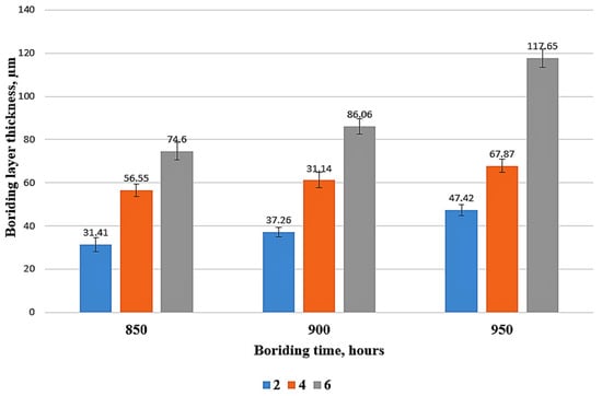 Figure 6 shows that the thicknesses of boride layers range from 31.41 to 117.65 µm depending on treatment temperature and time. Minimum and maximum boride layer thicknesses were observed at samples 852 and 956, respectively. The thickness measurements indicated that the thickness of the boride layer increased with increasing process time and temperature. The comparison of boride layer thicknesses of different steels between this study and the other studies in the literature is shown in Table 4. It shows that HMS has the second-highest borided layer thickness in high alloy steel. Although Sinha reported that manganese reduced the boride layer thickness in carbon steel [32], the thickness measurements show that Mn facilitates boron diffusion in HMS.