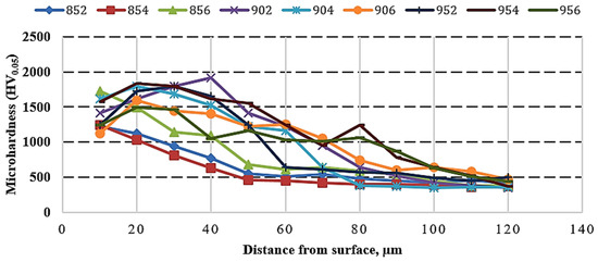 Figure 7 exhibits the cross-sectional microhardness measurement profile of borided HMS samples. The hardness of unborided HMS was 532 HV0.05. The highest hardness value was seen at 902 (1915 HV0.05). The hardness of the boride layers is approximately three to four times higher than that of the BM matrix due to the presence of FeB, Fe2B, and MnB phases which are significant for increasing the hardness of the surface. In the studies of Gök et al. [17] and Kayali [29], the high Cr content in steel caused chromium borides formation, which are harder than manganese borides, to reach hardness values of boride layer above 2000 HV. On the other hand, Duran et al., who boronized Inconel 718, was able to reach almost 1300 HV boron layer hardness due to the lower hardness of nickel borides than manganese borides [14]. Compared with unborided HMS, the hardness of the BM matrix in borided steel decreases with the effect of time and high temperature. However, in the literature, there is a common ratio between hardness and boriding time and temperature increases [17,29,31,41], which was not observed in this study. The changing distribution of various phases (MnB, FeB, Fe2B) in the boride layer can cause fluctuations in the hardness plot.