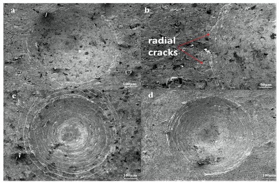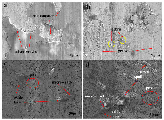 The surface morphologies of the worn samples are given in Figure 16. It is seen that the oxide layer (dark region) partially delaminates under repeated loads because of plastic deformations in Figure 16a. Micro-cracks also occurred on the oxide layer. In the wear test, it is observed that the oxide layers formed on the surface disappeared with the increase of the applied load in Figure 16b. The debris and grooves occurred on the surface of BM. Almost the entire surface of borided HMS had smooth wear tracks. Micro-cracks on the oxide layer and pits on the borided surface as a consequence of surface fatigue [50] can be observed in Figure 16c,d. Figure 16d shows that particle impact-induced brittle fracture caused spalling off of the oxide layer. Oxidative type local delamination was observed in borided HMS. The oxide layer is spalled off in an area much larger than the impact crater, while the substrate is almost unaffected [54].
