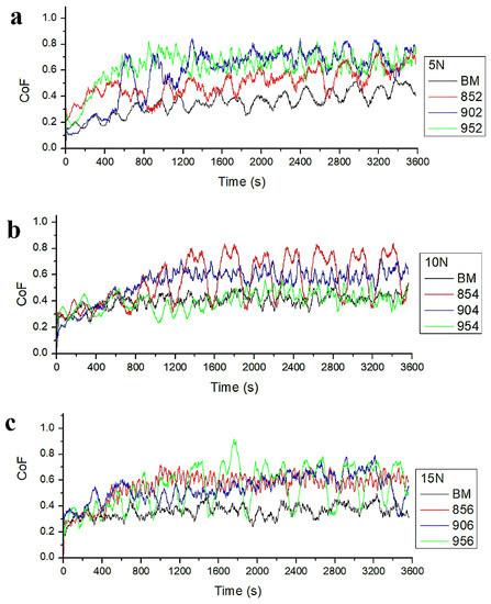 COF curves of samples: (a) 5 N, (b) 10 N, (c) 15 N.