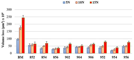 The volumetric wear results from dry sliding wear tests are shown in Figure 11. It exhibits that an increase in the applied load increases the volumetric wear losses of all samples. All borided samples performed lower volumetric wear loss than BM for each wear condition. The lowest volumetric wear losses were observed at sample 954 under the load of 5 and 10 N and sample 856 under the load of 15 N. Under 15 N load, sample 954 exhibited the second lowest volumetric wear loss. According to the literature, as boriding temperature and time increase, volumetric wear loss occurs [17,35]. This interpretation was related to the thickness and hardness of the boride layers obtained. In this study, a steady volumetric wear loss was not seen from tribological results of borided samples depending on the time and temperature increase. There are many parameters of material loss from the contacting surfaces under the loading such as work hardening tendency, applied load, type of relative movement, sliding speed, interfacial contact properties, and test environment, determining the contact stresses at the interface and material properties [30]. Each parameter might have caused this unsteady volumetric wear loss due to the complex morphology formed on the surface. In addition, reciprocating wear tests can affect the results of wear volume loss because of presences of wear debris at the sliding interface. Therefore, asperities might lead to different wear losses on the surfaces of each borided sample.