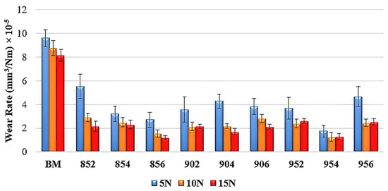 The wear rates of samples are shown in Figure 12. The lowest wear rate was obtained in 954, 954, 856 under the load of 5, 10 and 15 N, respectively. The highest wear rates were observed at BM for each load. The hardness of the boride layer is significant for the improvement of wear resistance [52]. Due to the hardness of the FeB, Fe2B, and MnB phases, borided HMS showed more resistance to wear. The wear rate of the borided steels is more than six times lower than BM under 15 N load. Both wear rate and wear volume loss test results show that the boriding process significantly increases the wear resistance of HMS.