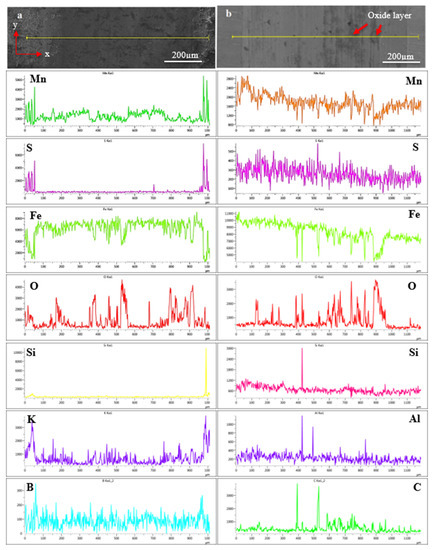 EDS analyses were carried out on the worn area after the dry sliding wear test. The results of EDS line and mapping analyses aimed at determining the changes in the amount of existing elements on the surface of borided samples and BM after the dry sliding wear tests. Figure 13a,b shows EDX line analyses of samples 854 and BM, respectively. The x axis indicates the wear track width, and the y axis defines the wear ball movement direction during the tribotest. Figure 13a shows that the amount of Mn, S, Si, and K significantly decreased after the wear test. K arose due to KBF4 in the boriding powder. B decreased after the wear test, but it was not as much as the elements mentioned above. There was no significant decrease in iron, however, a significant increase in oxygen along the line indicates that oxide compounds are formed there. It is seen that the regions where oxygen elements increase are in dark color in Figure 13b. The quantification results indicate the decrease in iron and the increase in oxygen in these dark regions. Most likely, iron oxide occurred on the surface after the wear test. Figure 13b shows that except Al, C, and Si, no significant decrease in other elements actualized.