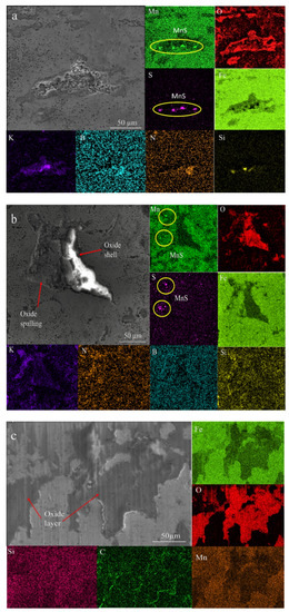 Figure 14 shows the cross-sectional view near the surface of HMS before the boriding process. MnS formation was not observed in Figure 14. EDS mapping analysis confirms the absence of MnS formation on the surface of HMS in SEM image.