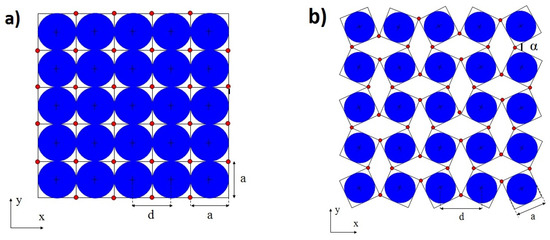 Initially, the two-dimensional model for Fe2O3 nano synthetic thin film is constructed by creating a 2D matrix square (mxm). These matrices are composed of nonmagnetic squares and linked together by hinges defined as the intersection points between the corners of the squares (red color in the figure), and these 2D square matrices may be deformed [95]. Then, spherical Fe2O3 nanoparticles were put into the 2D matrix square. For simplicity, we treat each nanoparticle as a magnetic spin. When the thin film model is not deformed, the rotation angle of these 2D square matrices has the value α = 0° (Figure 1a). When the 2D square matrices rotate, the corresponding rotation angle varies from α = 0° to α = 90° (Figure 1b).