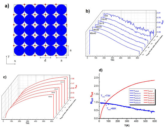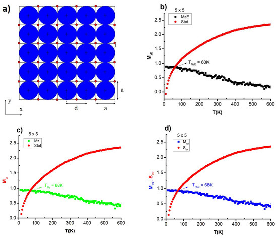 Shape (a), the relationship between magnetic characteristic quantities with different temperatures of Fe2O3 nanocomposite thin film with mxm = 5 × 5 (L = 27 nm), nano size (D), D = 6 nm, magnetic field B = 0.1 T, and rotation angle α = 90°. The magnetization in the preferred z-axis (b), the magnetization in the z-axis (c), and the total magnetization (d) with the total entropy.