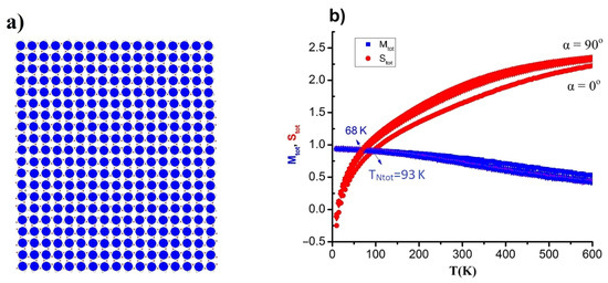 The obtained results show that the Fe2O3 nano synthetic thin film of size L = 27 nm has the shape given in Figure 3a. The total magnetization (Mtot) is shown by the blue line in Figure 3b, and the total entropy (Stot) is shown by the red line in Figure 3c. When temperature (T) increases from T = 10 K to T = 600 K, the magnetization (Mtot) decreases from Mtot = 0.941 to Mtot = 0.394, Stot increases from Stot = −0.069 to Stot = 2.354, and Neel’s magnetic phase transition temperature (TNtot) increases slightly from TNtot = 68 K to TNtot = 68, 68, 68, 71, 73 K (Figure 3d). The reason for these changes is that increasing temperature T leads to a shift of the domain walls. When the thin film size increases from L = 27 nm to L = 62, 96, 130, 198, 267 nm, the Mtot increases slightly from Mtot = 0.941 to Mtot = 0.944, 0.947, 0.952, 0.972, 0.983, respectively, because the increase in the thin film size of L leads to an increase in the density of spins. The obtained results are completely consistent with the simulation results of amorphous Fe nanoparticles [82]. The cause of this phenomenon is due to the size effect (when increasing the lattice size L leads to an increase in TNtot) with a negligible increase in results (about 9%). We chose Fe2O3 nano synthetic thin film with the nano size D = 6 nm, mxm = 20 × 20 corresponding to the size L = 130 nm as standard to study other influencing factors. Further, we investigated the influence of the spin angle of spin on the magnetic characteristic quantities.