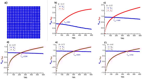 The results show that when Fe2O3 nano synthetic thin film with matrix size L = 130 nm, nanoparticle size D = 6 nm is placed in a magnetic field (B) with B = 0.1 T, the shape of Fe2O3 thin film is as in Figure 5a. The Mtot composite magnetization decreases from Mtot = 0.941 to Mtot = 0.404, the Stot composite entropy increases from Stot = −0.076 to Stot = 2.353, and the magnetic phase transition temperature is TNtot = 68 K (Figure 5b). When the external magnetic field increases from B = 0.1 T to B = 0.3, 0.5, 0.7, 0.9 T, the point above of total magnetization Mtot increases slightly from Mtot = 0.941 to Mtot = 0.943, the total entropy always increases from Stot = −0.076 to Stot = −0.932, the lower point of Mtot increases again from Mtot = 0.404 to Mtot = 0.754, 0.844, 0.881, 0.889, and Stot again decreases from Stot = 2.353, 1.789, 1.479, 1.295, 1.165. This leads to a decrease in the magnitude of M, while the magnitude of Stot increases. It implies that Stot tends to shift towards the negative axis, which leads to a corresponding increase in TNtot: TNtot = 68 K at B = 0.1 T (Figure 5b), TNtot = 148 K at B = 0.3 T (Figure 5c), TNtot = 228 K at B = 0.5 T (Figure 5d), TNtot = 300 K at B = 0.7 T (Figure 5e), TNtot = 376K at B = 0.9 T (Figure 5f). The cause of the change in TNtot is that an increase in B leads to the stronger orientation of the spins in the preferred direction of the magnetic field and they rotate very strongly with a large magnetic field. So, there is another problem: how to increase TNtot with a small external magnetic field?
