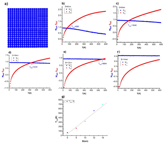 The Néel phase transition temperature (TNtot) of Fe2O3 nano synthetic thin film with mxm = 20 × 20, L = 130 nm, B = 0.1 T, rotation angle α = 90° for different nanoparticle sizes: the shape (a), the results for the size D = 6 nm (b), D = 8 nm (c), D = 10 nm (d), D = 12 nm (e), D = 14 nm (f) and TNtot depends on D (g).