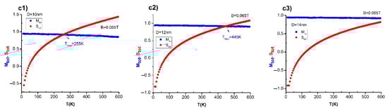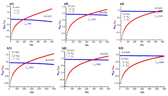 The results show that, when the Fe2O3 nano synthetic thin film is placed in the external magnetic field B = 0.025 T with the rotation angle α = 90° for the increase in the size of the nanoparticle D from D = 10 nm (L = 206 nm) to D = 12, 14 nm (L = 244, 282 nm), Mtot decreases from Mtot = 0.943 to Mtot = 0.740, and Stot increases from Stot = −0.597 to Stot = 1.803; whereas for D = 10 nm (L = 206 nm), Mtot decreases from Mtot = 0.941 to Mtot = 0.871, and Stot increases from Stot = −0.875 to Stot = 1.304; with D = 12 nm (L = 244 nm), Mtot decreases from Mtot = 0.936 to Mtot = 0.909, and Stot increases from Stot = −0.908 to Stot = 1.002. For D = 14 nm (L = 282 nm) we also have a decrease in the magnitude of Mtot and an increase in Stot. Therefore, as B and D increase, the magnetic phase transition temperature increases from TNtot = 185 K (Figure 7a1) to TNtot = 324 K (Figure 7a2), 515 K (Figure 7a3). For B = 0.045 T, when D increases from D = 10 nm (L = 206 nm) to D = 12, 14 nm (L = 244, 282 nm), the magnetic phase transition temperature increases from TNtot = 220 K (Figure 7b1) to TNtot = 383 K (Figure 7b2), 596 K (Figure 7b3). With B = 0.065 T, when D increases from D = 10 nm (L = 206 nm) to D = 12, 14 nm (L = 244, 282 nm), the magnetic phase transition temperature increases from TNtot = 255 K (Figure 7c1) to TNtot = 445 K (Figure 7c2), and TNtot > 600 K (Figure 7c3). The obtained results show that, at room temperature, because the magnetic field of the earth, B, is very small, one can increase the nanoparticle size to nearly 12 nm, then TNtot = T = 300 K. In addition, between TNtot and D there is a relationship that satisfies the equation TNtot = −440.6 + 83D. This is a very useful result. In practice, researchers can manufacture Fe2O3 thin films right at ambient conditions (at room temperature). Achieving the size D = 12 nm (L = 244 nm), these thin films can be used not only in magnetic devices.
