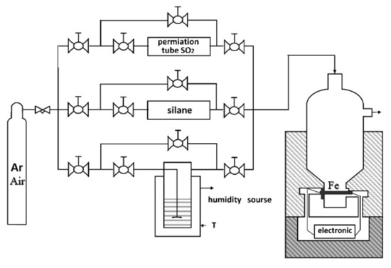 Figure 1 shows the schematic of the glass pipe system that was used for vapour phase silane deposition and the study of the modified iron surface [19,20,21]. Silane evaporates in the glass pipe system in the flow of Ar (spectral purity, the flow 1800 cm3/min) and adsorbs on the iron surface in the QCM cell. The mass gain on the Fe surface was studied as a function of Ar humidity. Silane partial pressure in gas flow was kept constant in all experiments. To humidify Ar, the part of the flow (200 cm3/min) was passed through the humidifier. The gas humidity in the cell was controlled during all measurements.