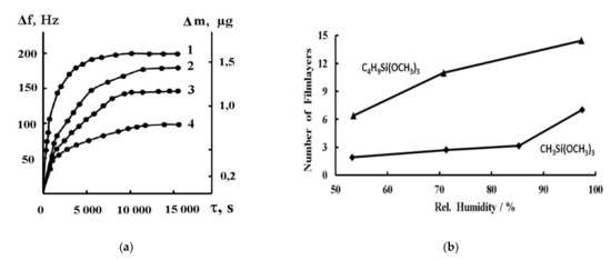 (a)—Variation of the frequency of iron QCM and calculated mass gain as a function of irreversible adsorption of MTMS (2, 4) and BTMS (1, 3). The Ar humidity was 53.3% RH (3, 4) and 100% RH (1, 2) [20]. (b)—the films thicknesses (monolayers) vs. relative humidity of Ar used at the deposition [19,20]. Published with permission from NAUKA/INTERPERIODIKA 1994.