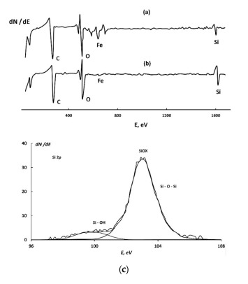 Auger and X-ray Photoelectron spectroscopes were applied to investigate the surfaces. The formation of thin siloxane films was evidenced. Scanning Kelvin Probe was applied to study the iron-siloxane interface. Fe–O–Si bonds increased the potential of iron for 300–340 mV due to the creation of the oriented layer of ionic dipoles at the interface. These bonds, in addition to iron oxide, passivate the iron surface.