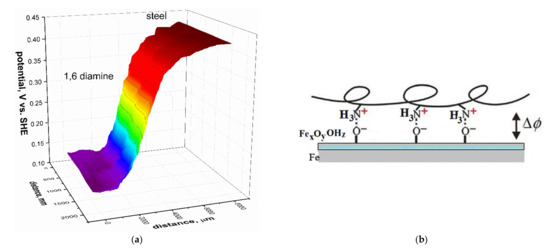 Adsorption of the amines creates the dipoles with a positive charge on the amino groups and the negative one on the iron oxide surface of the substrate (Equation (4), Figure 7). Normally, the formation of this kind of dipoles decreases the ewf and the potential measured by SKP for the different metals [38,39,40,41]. For example, the effect of the vapour deposition of 1.6 hexanediamine on the left part of the iron surface is shown in Figure 7a [40]. At the left-hand side of the profile, the potential decreased for 300 mV relatively bare iron surface (right-hand side) due to the formation of dipoles (Figure 7b).