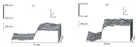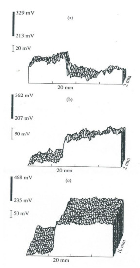 SKP was applied to describe the interaction of the silane coupling agent with the iron surface [22]. Figure 8 shows potential distribution above the surface with locally deposited BTMS and γ-aminopropyl trimethoxysilane (ATMS) [22,39]. Thick siloxane islands (4 μm thick) were deposited using a droplet of water solutions of the silanes [22]. After drying in ambient air, the potential distribution was measured (Figure 8). It was found that butylsiloxane increased the potential of the Fe for 300–500 mV and the aminosiloxane decreased the potential for 300–350 mV. The different signs of the potential drops across siloxane–iron joints can show the different structures of the interface.