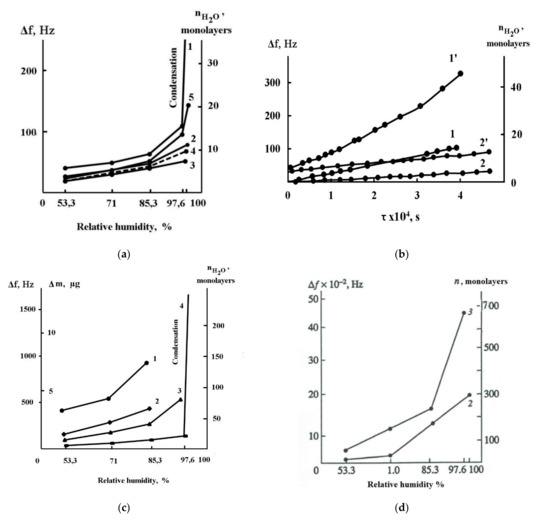 (a)—QCM detection of water adsorption on the iron surface with pre-adsorbed siloxanes as function of Ar humidity (a). 1—bare Fe surface, 2—MTMS 5 monolayers, 3—MTMS 10 monolayers, 4—BTMS 6 monolayers, 5—BTMS 12 monolayers. (b)—Monitoring of the frequency change and water layers gain during long time exposure of the modified surfaces in Ar flow at 100% RH. 1, 1’—BTMS and 2, 2’—MTMS. 1, 2—measurements in Ar 0% RH and 1’, 2’ measurements in Ar at 100% RH. (c)—water adsorption vs. Ar humidity on thick siloxane films. 1—MTMS 35 monolayers, 2–BTMS 28 monolayers, 3—BTMS 18 monolayers, 4—bare iron surface. (d)—frequency decrease and calculated gain of water adsorption on thin films 2, 3 (Figure 11a) after addition SO2 in Ar atmosphere. Published with permission from NAUKA/INTERPERIODIKA 1994.