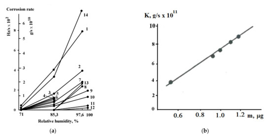 (a)—QCM measurements of iron corrosion rate in the air of different humidity with grafted thin siloxane films; 1—bare iron, 2–6, 9, 10 thin BTMS films of 6–12 monolayers; 7, 8, 13—one monolayer MTMS films; 11, 12—MTMS films 3 and 6 monolayers, 14—BTMS 18 monolayers. (b)—Fe corrosion rate vs. water adsorption in the air at 85.3% RH [21]. Published with permission from NAUKA/INTERPERIODIKA 1994.